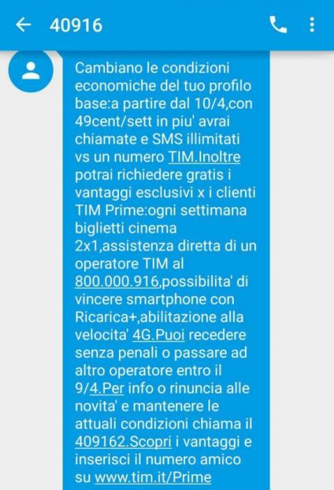 I clienti non interessati alle modifiche avranno il diritto di recedere dal contratto, o passare ad altro operatore, senza penali entro la data riportata nel sms ricevuto, chiamando il 409162 e seguendo le istruzioni della voce guida, oppure, compilando l’apposito modulo o inviando un sms al 119 con testo “CESSAZIONE SIM” o chiamando il 119.