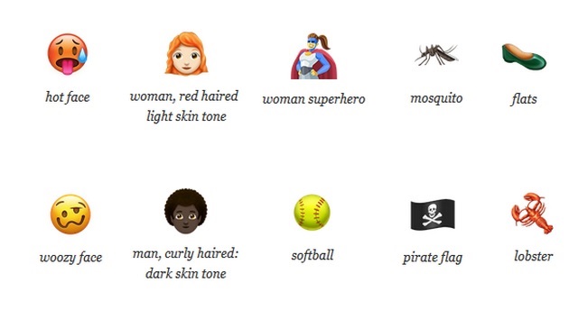 Le nuove emoji includono uomo e donna con diversi stili di capelli (capelli rossi, capelli ricci, capelli bianchi e calvi), emoji supereroe, faccia accaldata, faccia congelata, ippopotamo e tanti altri ancora.