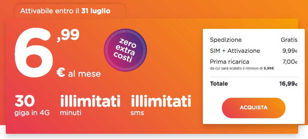 L'offerta è la stessa di Iliad per quanto riguarda 30 giga, minuti ed SMS illimitati, ma qui si paga 1 euro in più al mese. Un sovrapprezzo accettabile se consideriamo che la rete è quella di Vodafone, che ha la migliore rete 4G in tutta Italia.