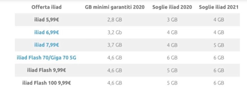 Ecco una tabella che mostra, per ogni offerta Iliad, i giga che si dovrebbero avere a disposizione e quelli in più offerti dall'operatore ai propri clienti: