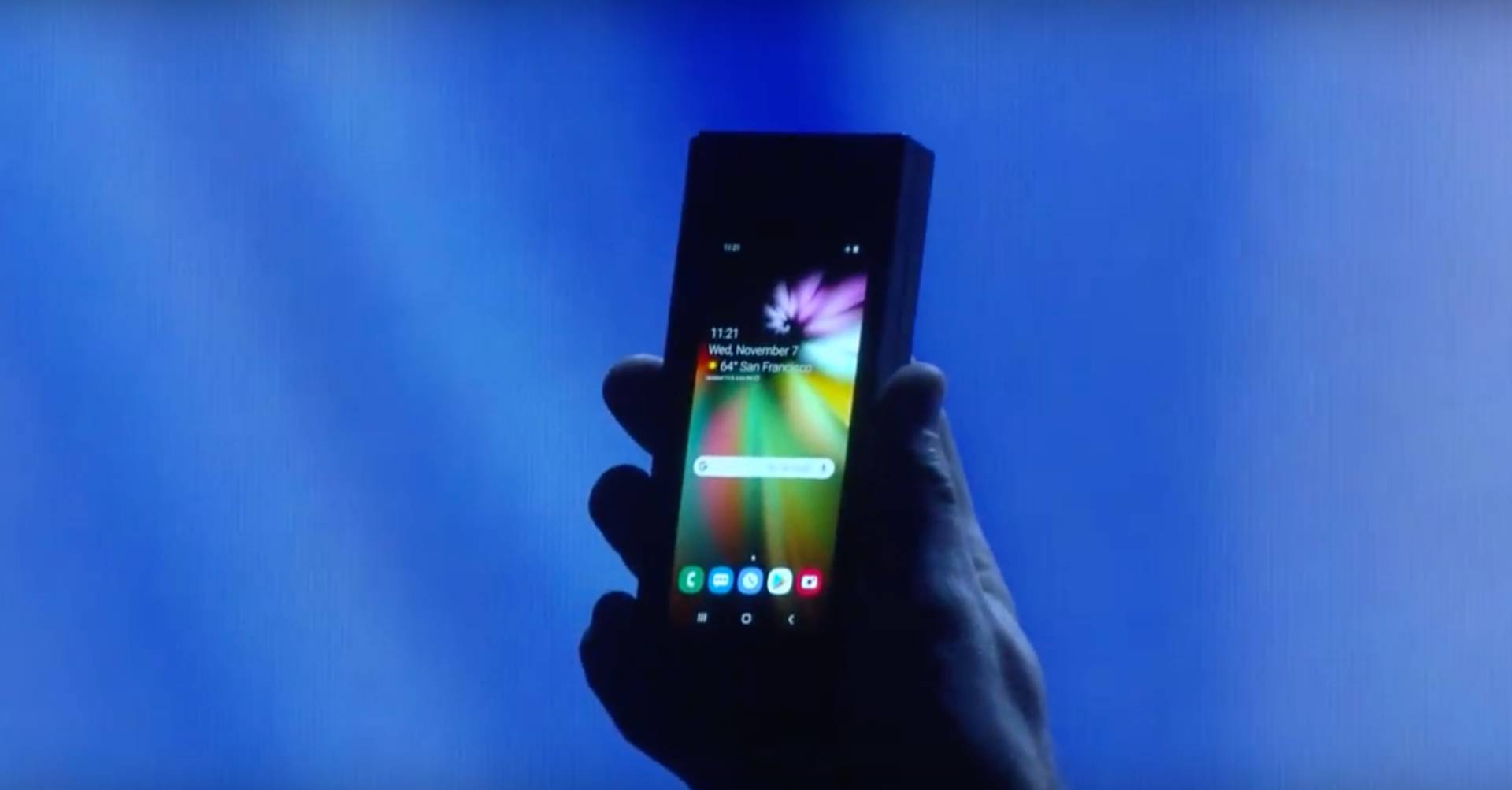 Basato su Android, dove si notano le icone Play Store e la soluzione tecnologica per il display è identificata da Samsung con il nome di Infinity Flex Display, cioè il display sviluppato da Samsung proprio per soluzioni pieghevoli come sullo smartphone, che avrà ben 7 strati "di display".