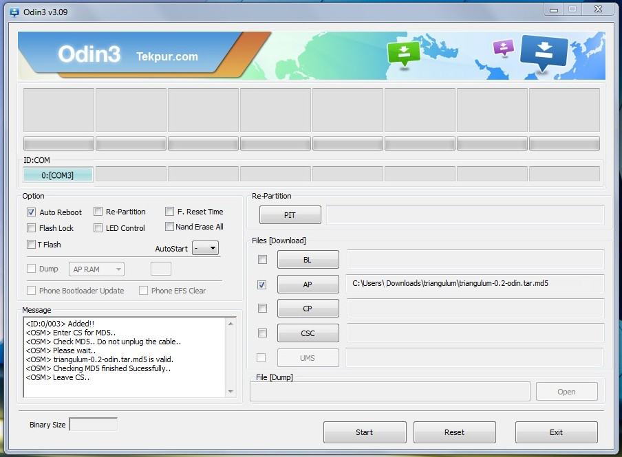 Collegate lo smartwatch al PC ed avviate Odin. Verificate che il programma abbia riconosciuto lo smartphone controllando che la porta ID:COM sia associata ad un numero e che cambi colore. Se non viene riconosciuto reinstallate i driver!