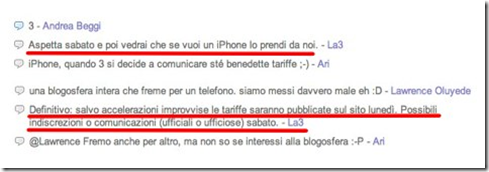 Leggendo questa conversazione, però, possiamo stare tranquilli che entro pochi giorni avremo a disposizione le tariffe ufficiali proposte da 3 Italia, che saranno sicuramente più basse e convenienti rispetto a quelle (esagerate) proposte da Tim e Vodafone.