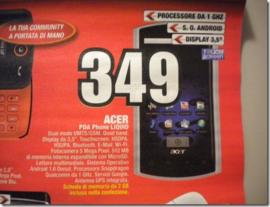Come potete vedere nell’immagine, da domani in tutti i punti vendita MediaWorld sarà possibile acquistare Acer Liquid al prezzo di 349€.