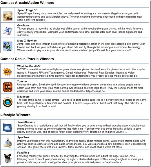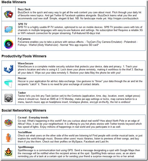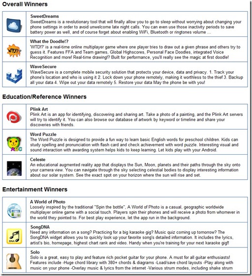 Vincitori assoluti: abbiamo tre software molto interessanti ed innovativi. Wave Secure è una sorta di antifurto per il nostro telefono, che consente di proteggere dati e privacy in caso di furto. What The Doodle è un gioco multiplayer da giocare online, mentre SweetDreams permette di dormire sonni tranquilli in quanto penserà a fare risparmiare batteria al telefono disattivando praticamente ogni tipo di connessione che abbiamo lasciato accesa prima di andare a letto.