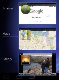 Il multitasking è e resta un grande punto di forza di Android ed è centrale per sfruttare pienamente Android 3.0. Cambierà il modo di visualizzare e mostrare le applicazioni attive: queste verranno ora mostrate tramite un menu a scomparsa direttamente dalla barra delle notifiche e i vari programmi in background saranno visualizzati con una grafica tridimensionale e molto gradevole. Inoltre, per aiutare gli utenti ad identificare rapidamente l'attività associata a ciascuna applicazione, l'elenco mostrerà uno screenshot dello stato del programma risalente all’ultimo momento in cui il software è stato utilizzato dall’utente.