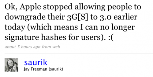 Saurik, autore di numerosi metodi per sbloccare e downgradare i vari firmware dell’iPhone, comunica a tutti, tramite il suo account Twitter, che con l’introduzione del nuovo firmware 3.1 Apple ha bloccato la possibilità di eseguire il downgrade a versioni precedenti.