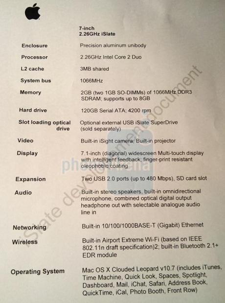 Il sito PhoneArena ha ricevuto in anteprima mondiale quelle che, almeno in linea teorica, dovrebbero essere le scansioni di un documento segreto ed interno ad Apple, in cui vengono riportate le specifiche tecniche ufficiali del tanto atteso tablet, che dovrebbe essere presentato il 26 di Gennaio.
