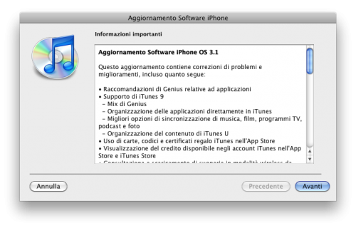 ATTENZIONE: il nuovo Firmware 3.1 aggiorna la versione del modem (baseband), per cui i possessori di un iPhone 3G e 3GS straniero NON devono assolutamente aggiornare, altrimenti perderanno PER SEMPRE la possibilità di sbloccare la parte telefonica del loro iPhone.