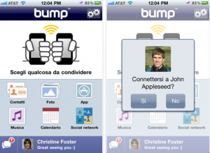Bump è un modo semplice e veloce per collegare due telefoni semplicemente “scuotendo” il nostro iPhone o iPod Touch insieme. Semplice e pratico, una volta effettuato l'accesso ed inseriti i dati richiesti, potrete con un delicato colpo di iPhone trasferire i vostri dati da un dispositivo all'altro. E’ anche possibile fare bump con gli amici a distanza! Basterà aggiungerli alla lista degli amici all’interno di Bump per poter iniziare a comunicare immediatamente, si tratta del “bump virtuale”.