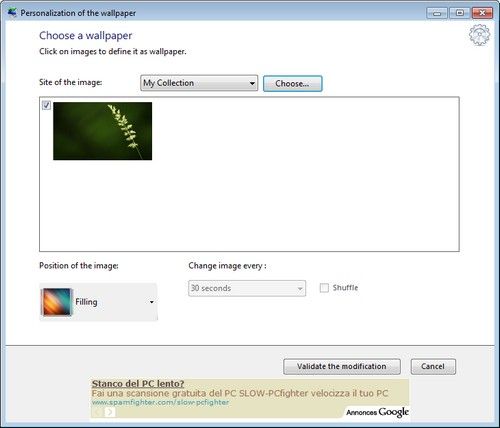 Molto interessante anche la possibilità di impostare più sfondi a rotazione, selezionando varie immagini con il pulsante Choose, mettendo il segno di spunta accanto alle anteprime degli sfondi e cliccando sul pulsante Validate the modification. Per impostare il numero di minuti dopo i quali cambiare automaticamente lo sfondo del desktop, sfruttate il menu a tendina collocato sotto la voce Change image every.