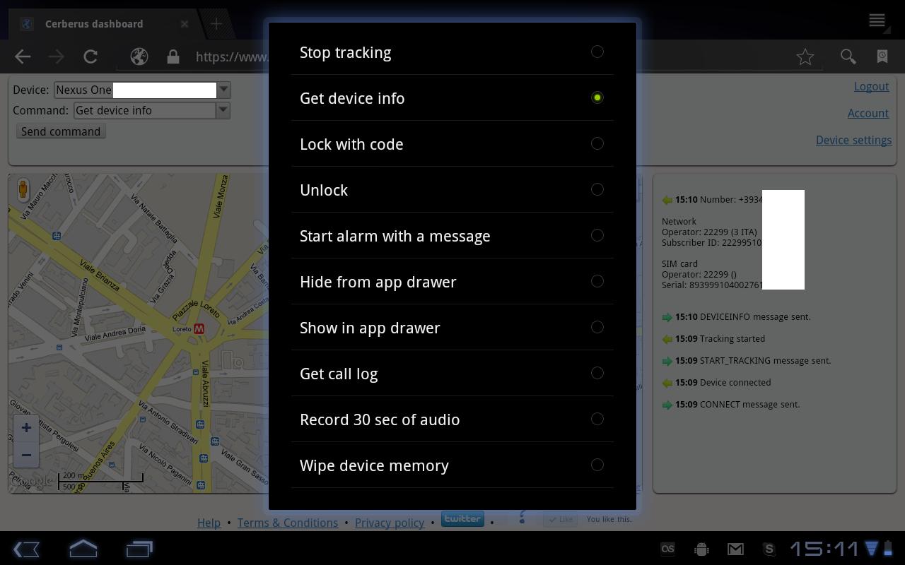 Come è possibile notare, dal sito ufficiale avremo la possibilità di controllare praticamente ogni aspetto del software: potremo individuare il telefono sulla mappa di Google, attivare l'allarme, nascondere il software, cancellare tutto il contenuto del telefono e tanto altro ancora. Un tool potente e completo che rende Cerberus unico ed utilissimo nello stesso tempo.