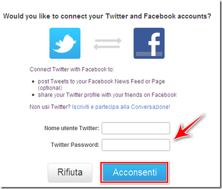 Nella pagina Facebook dell’applicazione sarà necessario, per connettere automaticamente gli accounts, inserire il nome utente e la password del proprio account Twitter e successivamente autorizzare l’applicazione a pubblicare automaticamente i nuovi tweet da condividere sul nostro profilo Facebook.