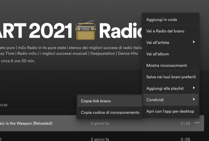 - andare su Spotify e copiare l'URL/link di una canzone che ti interessa o di una playlist