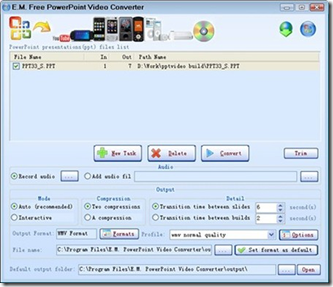 Il programma di cui avrete bisogno si chiama E.M. Free Power Point Video Converter e permette di convertire le presentazioni PowerPoint in formato video, come AVI, WMV, MPEG4, MPEG, immagini BMP e audio MP3.