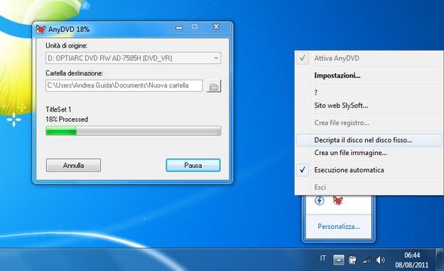 A questo punto inserite nel lettore DVD del PC il film protetto che volete copiare. Avviate AnyDVD e selezionate la voce Decripta il disco nel disco fisso dal menu che compare. Questa operazione vi permetterà di copiare il contenuto del DVD sul disco fisso del computer.
