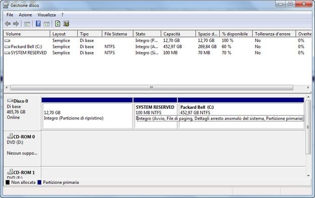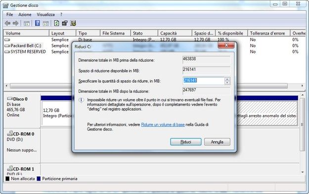 Se vuoi creare una nuova partizione su Windows 7 devi prima ridurre quella principale che attualmente occupa tutto lo spazio disponibile dell’hard disk (ossia C:) in modo da sottrargli lo spazio che poi andrai ad utilizzare per la nuova partizione.