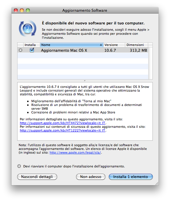 L'aggiornamento 10.6.7 è consigliato a tutti gli utenti che utilizzano Mac OS X Snow Leopard e include correzioni generali del sistema operativo che ottimizzano la stabilità, compatibilità e sicurezza di Mac, tra cui:
