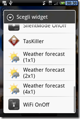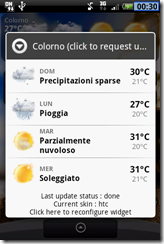 Sarà possibile scegliere di visualizzare le previsioni nella home tramite 3 tipi di widget (4x1, 1x1, 2x1); potremo inoltre decidere ogni quanto tempo aggiornare automaticamente le previsioni o se farlo in modo manuale. Ovviamente, l’aggiornamento automatico comporterà un maggior consumo di batteria.