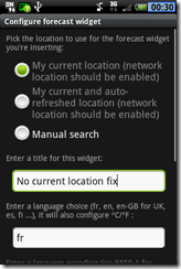 Quando andremo ad aggiungere il widget, potremo personalizzare altre impostazioni, come: modalità di localizzazione (GPS, impostazione manuale, automatica tramite GPS e rete internet), la lingua, le modalità di misurazione (C o F), la frequenza di aggiornamento e la skin.