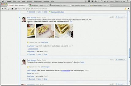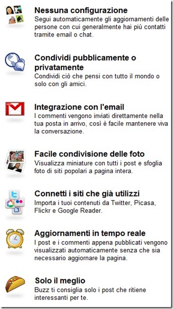 In sostanza, Buzz dovrebbe essere una sorta di potenziamento per Gmail, che permetterà di condividere con tutti i nostri amici non solo i nostri aggiornamenti di stato, ma anche gli articoli, i link, video e foto.