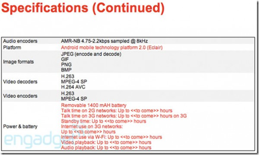 Si, avete letto bene. 2.0. Ci deve essere qualcosa di inesatto. Come sappiamo, infatti, il sistema operativo sarà Android 2.1 Flan, quindi o la scheda tecnica che ci è pervenuta è errata, o si tratta di un colossale fake.