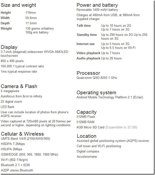 Infine, la batteria sarà da 1400Mah, in grado di garantire un’autonomia di 10 ore in conversazione, 290 in stand-by, 5 ore in navigazione internet 3G (6.5 in WiFi) e 7 ore di riproduzione video o 20 di musica. Se davvero dovesse comportarsi così, sarebbe una batteria praticamente infinita, ma dubito che questa sia la durata reale.