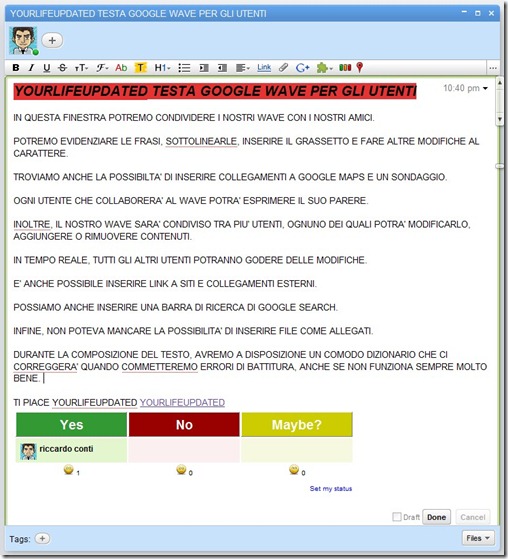 In pratica, potremo creare una sorta di conferenza con i nostri contatti, dare vita ad un documento “comune”, che questi potranno non solo leggere, ma anche modificare in tempo reale. E tutti i partecipanti al Wave potranno godere istantaneamente delle modifiche.