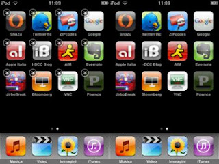 cancellare una qualsiasi applicazione direttamente dal vostro iPhone 3G. Non importa se il file è stato installato tramite AppStore o tramite Cydia, il procedimento è lo stesso.Dovrete tenere premuto sull'icona del file che volete eliminare, finchè il telefono non inzierà a vibrare. Solitamente questa procedura serve per spostare a piacimento le icone dei programmi, ma potrete notare che comparirà anche una X nello spazio in alto dello schermo, che vi permetterà di eliminare il file selezionato.