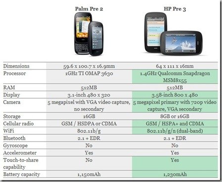 Di seguito trovate anche una tabella completa con le caratteristiche del terminale, messo a confronto con il “vecchio” Palm Pre 2, dal quale prende chiaramente il design.