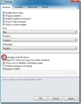 Tra le varie impostazioni da configurare, vi consiglio di immettere manualmente la località in cui vi trovate. Inoltre, per evitare di attivare manualmente il widget ad ogni avvio del sistema, è meglio spuntare anche la voce “Autostart with Windows”.
