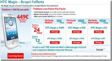 Il tanto atteso HTC Magic è quasi arrivato sul mercato italiano. Diego di TecnoPhone mi segnala che Vodafone ha pubblicato online la pagina ufficiale dedicata a questo smartphone, per cui andiamo ad analizzare insieme le tariffe che ci verranno proposte dall’operatore anglosassone.