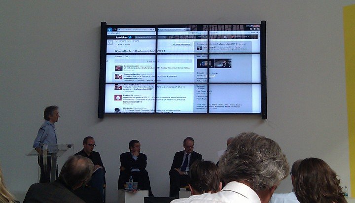 Nonostante le condizioni atmosferiche poco rassicuranti ho deciso di recarmi alla conferenza con la mia fidata bicicletta, giunto sul posto all' entrata ad ogni persona è stata distribuita una copia della rivista Wired di giugno e un libretto del Rapporto con tutti gli argomenti che verranno affrontati nel dibattito. Con mio grande stupore la sala non era molto gremita ma alle 16:30 in punto è iniziata la presentazione al pubblico tenendo costantemente aggiornati i presenti con l 'andamento del Referendum 2011 via Twitter attraverso la ricerca dell' hashtag #Referendum2011 per scoprire nei tweet delle persone i pareri e le opinioni pubbliche.