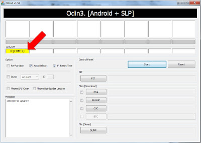 - Collegare il Device al Pc e in Odin dovrebbe comparire la scritta gialla Com:xx (Immagine Esplicativa)