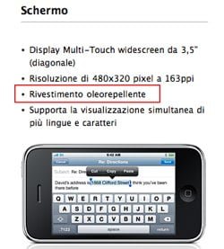 Tra le novità introdotte dal nuovo iPhone 3Gs, segnalo la presenza di un nuovo schermo, con una copertura particolare anti-ditate. Questo traguardo è stato ottenuto grazie ad un trattamento oleorepell...