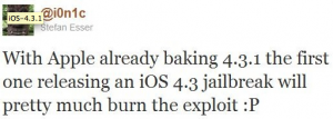 I0n1c ha fatto sapere tramite il suo account Twitter che sarà necessario attendere il rilascio da parte di Apple del nuovo iOS 4.3.1 prima di vedere il nuovo tool per il jailbreak untethered. Infatti...