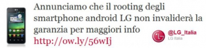 L'azienda, infatti, ha annunciato tramite Twitter che tutti i possessori di uno smartphone Android prodotto da LG potranno usufruire della garanzia anche se il terminale ha il ROOT oppure monta un firmware non ufficiale.