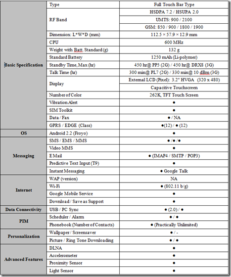 LG Optimus Chic: Scheda Tecnica Ufficiale