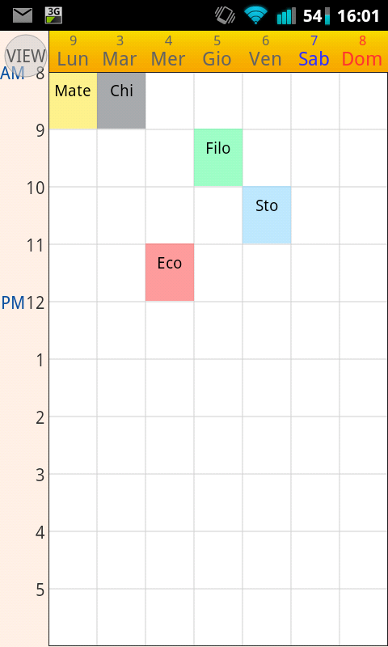Come si vede dall'immagine l'applicazione si presenta con la classica schermata settimanale degli orari proprio come il classico foglio cartaceo, basterà semplicemente premere il tasto in alto a sinistra "EDIT/VIEW" per modificare e visualizzare la tabella; nelle opzioni sarà possibile cambiare il colore della griglia o della materia a vostro piacimento.