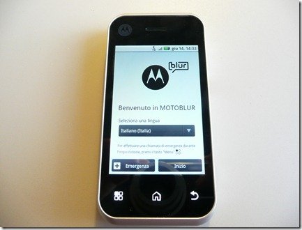 Subito dopo l’accensione, il terminale richiede una breve configurazione (e registrazione) al servizio Motoblur, che ci permetterà di gestire mail, messaggi e social network direttamente dalla homescreen di Android.