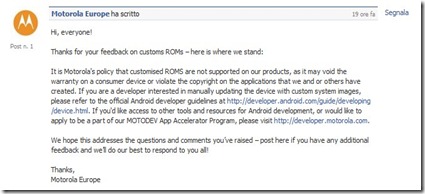 Contrariamente a quanto affermato negli scorsi giorni, la casa americana, tramite il proprio canale Facebook, ha sostanzialmente chiuso ogni speranza per quanto riguarda l’installazione di Custom Roms sui nostri Milestone.