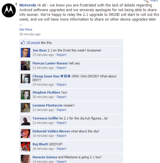 Solo poche ore fa vi abbiamo annunciato che presto arriverà l’aggiornamento ad Android 2.1 per il Motorola Droid americano.Su Facebook, però, la “casa alata” ha annunciato ufficialmente che l’attesiss...
