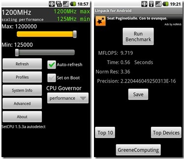 Come testimoniano le immagini, sono subito stati eseguiti dei test di performance con il software Linpack, che ha evidenziato come, alla frequenza di 1.2Ghz, il processore del Milestone sia in grado di bruciare quello del Nexus One. I risultati parlano chiaro: a 1.2Ghz il Milestone fa 9.7 MFLOPS, il Nexus a 1.1Ghz ne fa circa 8.