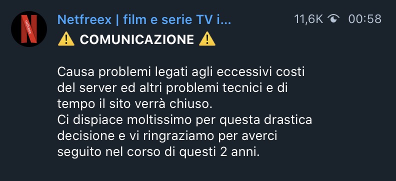 La conferma è arrivata anche dal gruppo Telegram ufficiale di Netfreex, che riporta quanto segue: