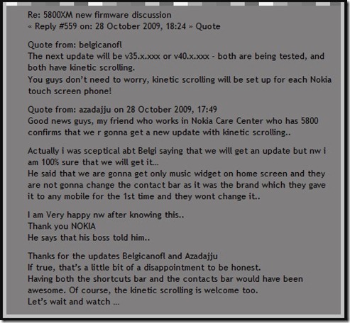 Come è facile notare, presso i laboratori Nokia sono in fase di testing ben due firmware per Nokia 5800: uno numerato v35 e l’altro numerato v40. Entrambi, comunque, hanno lo scrolling cinetico. L’utente, inoltre, afferma con estrema certezza che presto tutti gli smartphone touch di Nokia avranno lo scrolling cinetico.