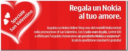Il 14 febbraio, acquistando sul Nokia Online Shop uno degli smartphone proposti, sarà possibile ricevere un prodotto Nokia a sorpresa pagando un solo euro aggiuntivo. La promozione, però, è valida solo per i primi 100 acquirenti del giorno.