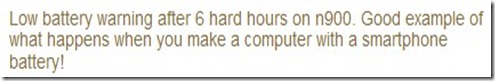 A mio avviso, oltre 6 ore di autonomia con uso intenso sono più che buone. Considerate che il mio iPhone dura 1 giorno con un uso medio, quindi alla fine la batteria del Nokia N900 durerà all’incirca come quella dell’iPhone, se non di più. Una cosa accettabile se paragonata alla durata media della batteria degli smartphone di fascia alta.