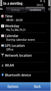 Se siete in riunione è molto probabile che siate in un ufficio. Magari il vostro. E se siete in ufficio probabilmente avrete a disposizione una rete Wifi. Situations la riconosce e sa così che siete in ufficio. Ma non basta. Con tutta probabilità avrete segnato sulla vostra agenda elettronica la vostra riunione. Lui va a scartabellare e che ti trova? Una riunione alle 17! Dove? In ufficio. Sono le 17, sono in ufficio ergo...riunione! E lì i normali settaggi che preferite (Volumi, vibrazioni, toni tastiera, avvisi, numero squilli, beeps, cella gsm o umts, risparmio energia, lancio applicazioni ecc... ecc...).