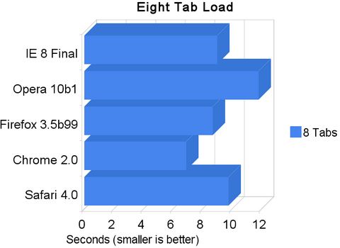 Anche questa volta è Chrome il più rapido nell’aprire otto pagine Web contemporaneamente, tra cui quelle complesse di “Lifehacker” e “Gizmodo“, quella parzialmente in flash di “YouTube“, quella classica di “Google” e tutte le home page dei browser sotto esame.