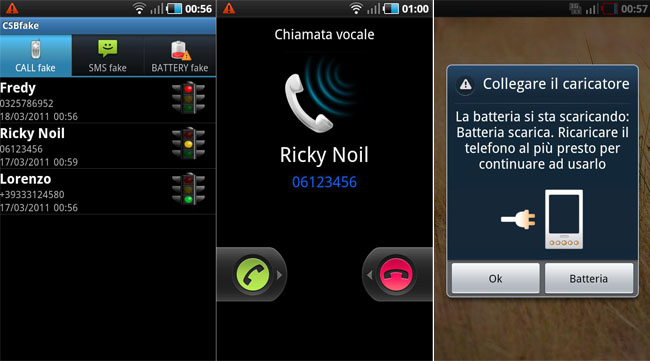 Il software si chiama CSBFake e permette di ricevere false chiamate. Risulta dunque molto utile per farci uscire da situazioni scomode, oppure per non prestare il telefono agli amici, in quanto nello stesso tempo permette anche di simulare l'avviso di batteria scarica o di ricezione di un messaggio di testo SMS.